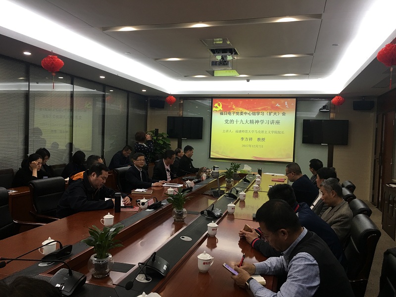 2017年127日下午,福日電子以黨委中心組學習(擴大)會的形式舉辦黨的十九大精神學習講座,特邀福建師范大學馬克思主義學院院長、博士生導師李方祥教授作了題為《新思想引領新時代,新使命開啟新征程》的十九大精神輔導,公司黨委委員、成員企業、事業部副總以上領導、本部助理以上管理人員以及機關支部全體黨員近40人參會。